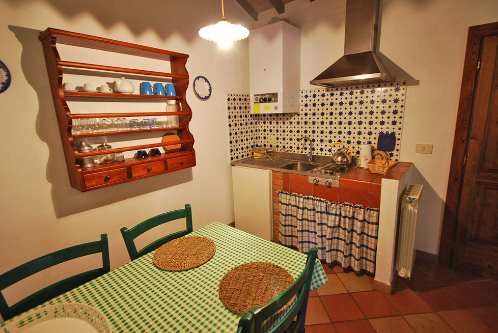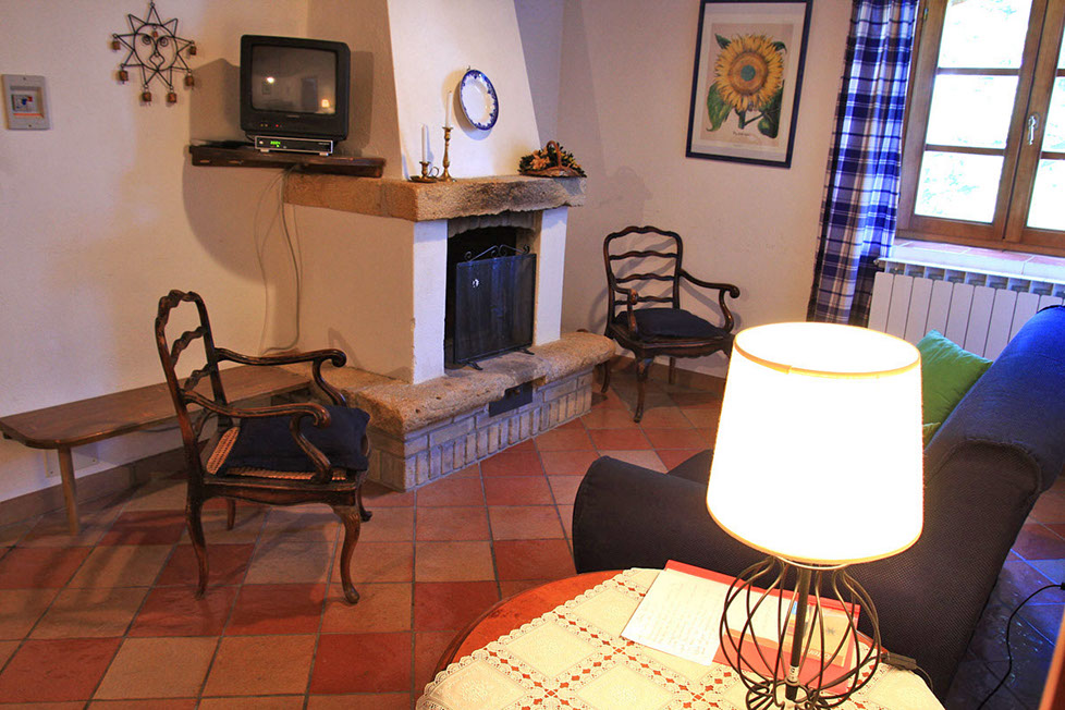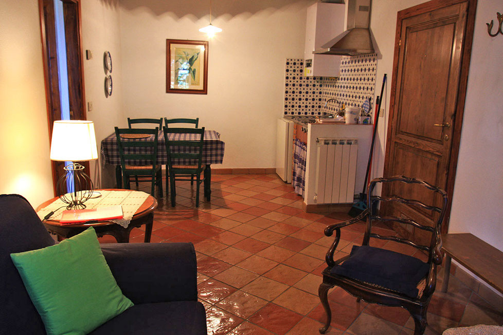 Appartamento al primo piano che affaccia sulla vallata e sul tramonto; composto da soggiorno con camino in pietra e divano letto singolo, zona pranzo con angolo cottura, camera matrimoniale e bagno con doccia.