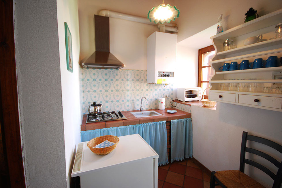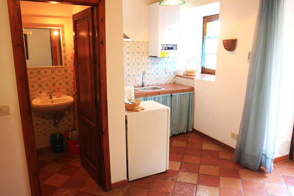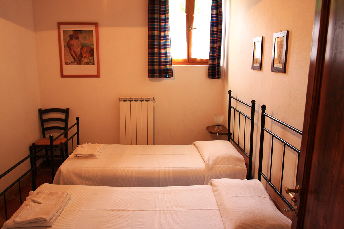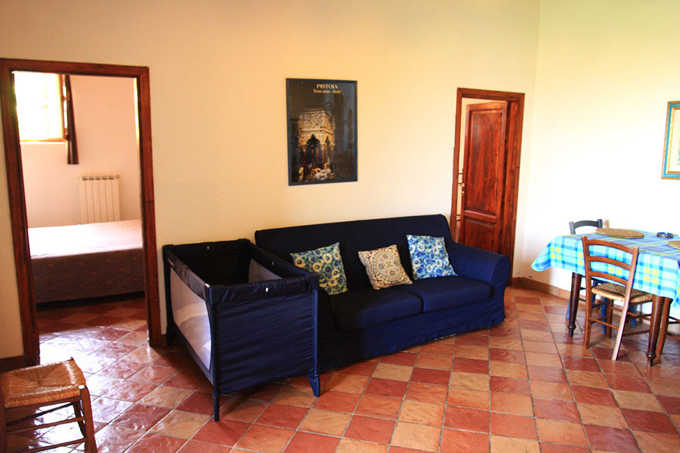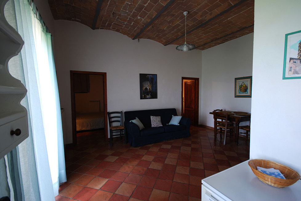 Appartamento a piano terra che affaccia su un bel prato con vista sulla vallata e sulle colline pisane; composto da ampio e  soggiorno con divano letto, zona pranzo, angolo cottura con vecchio lavello in pietra, due camere doppie o matrimoniali (a seconda delle esigenze) e bagno comune con doccia.